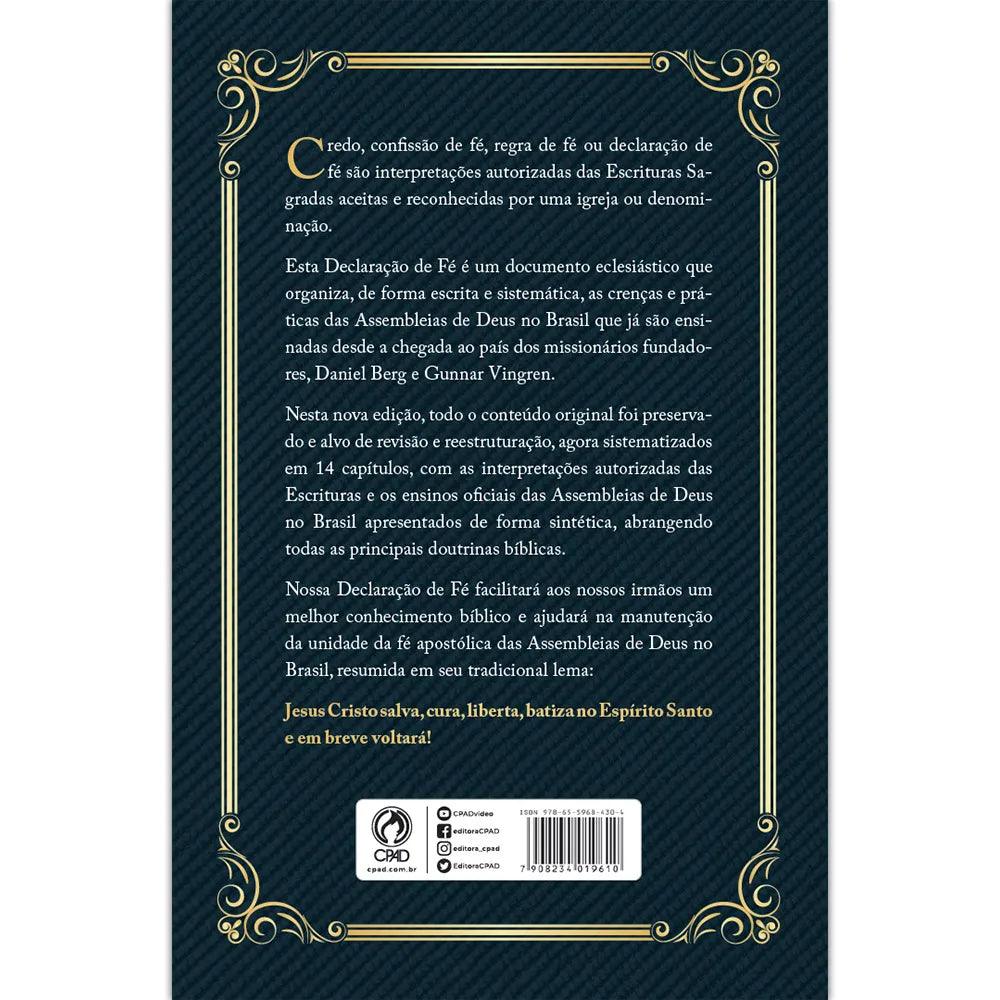 Esta Declaração de Fé é um documento eclesiástico que organiza, de forma escrita e sistemática, as crenças e práticas das Assembleias de Deus no Brasil. Nesta nova edição, todo o conteúdo original foi preservado e alvo de revisão e reestruturação, agora sistematizados em 14 capítulos apresentados de forma sintética, abrangendo todas as principais doutrinas bíblicas.