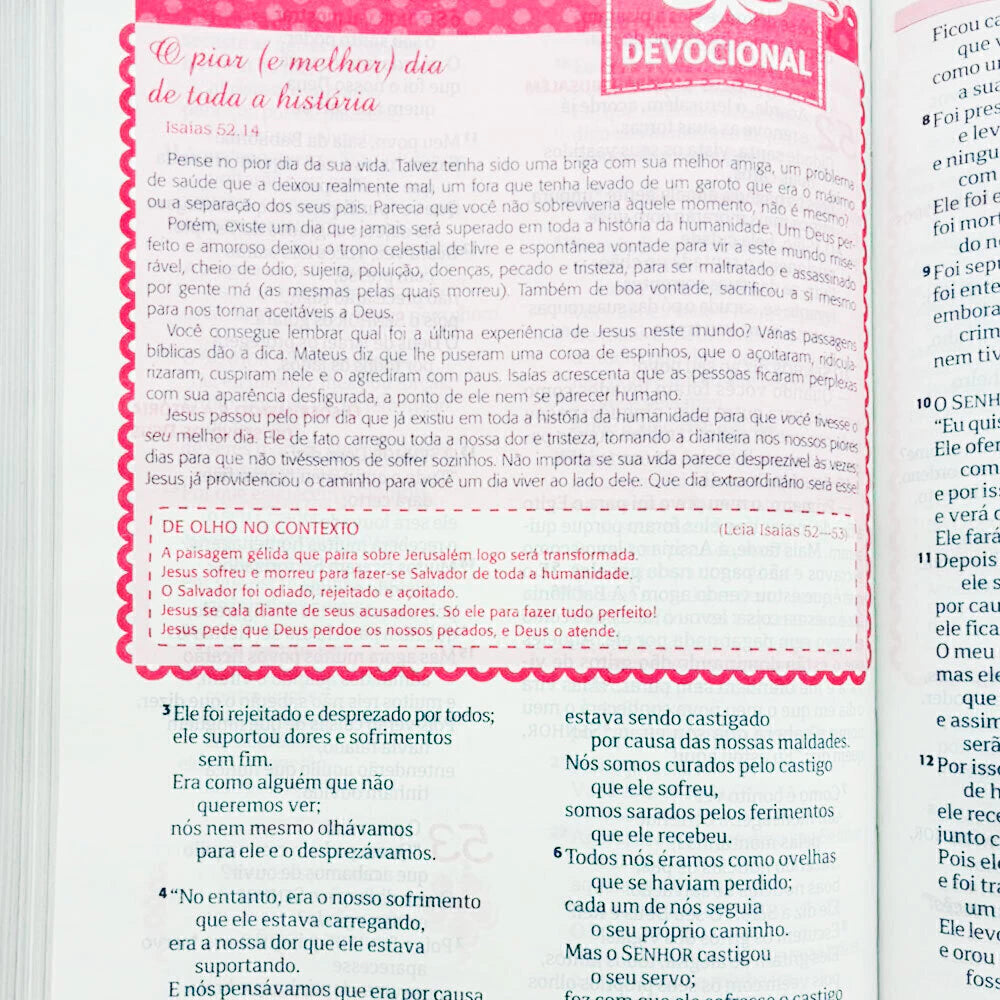 Uma Bíblia pensada especialmente para o coração das meninas. Esta edição exclusiva da Bíblia Entre Meninas e Deus foi desenvolvida para criar uma conexão única e pessoal entre as jovens e a Palavra de Deus. Com a Nova Tradução na Linguagem de Hoje (NTLH), as Escrituras ganham vida em uma linguagem clara, atual e acessível, perfeita para a nova geração.